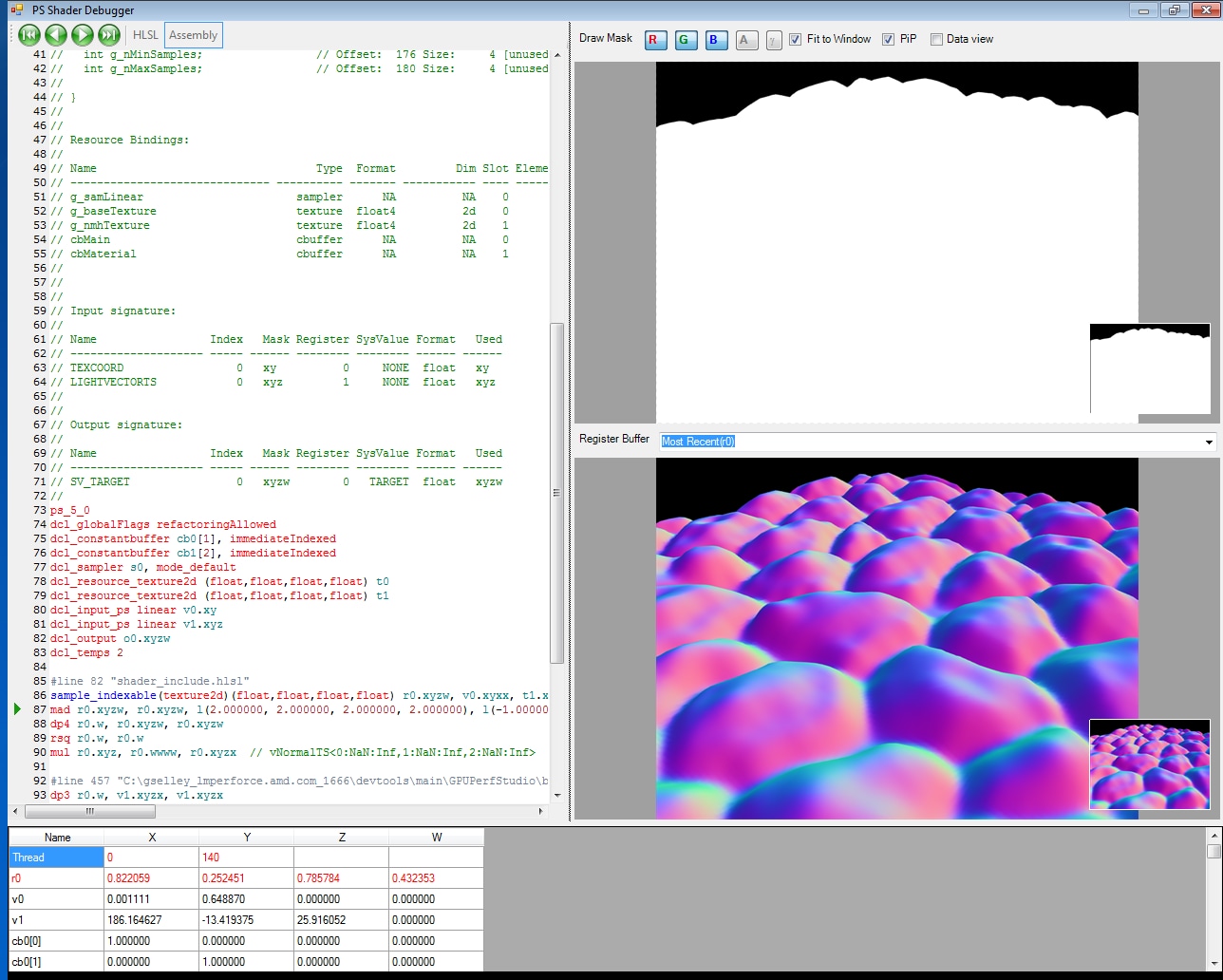 The Shader Debugger allows you to debug HLSL and ASM Pixel, Compute, and Vertex Shaders inside your application. It allows you to step through your shaders one line at a time and view the registers, variables, and constant values at each pixel. It is even possible to insert breakpoints in the code so that you can quickly jump to a particular line and start debugging. To aid in understanding the flow control of your shader, a Draw Mask image visualizes which pixels were written by the previous instruction.
