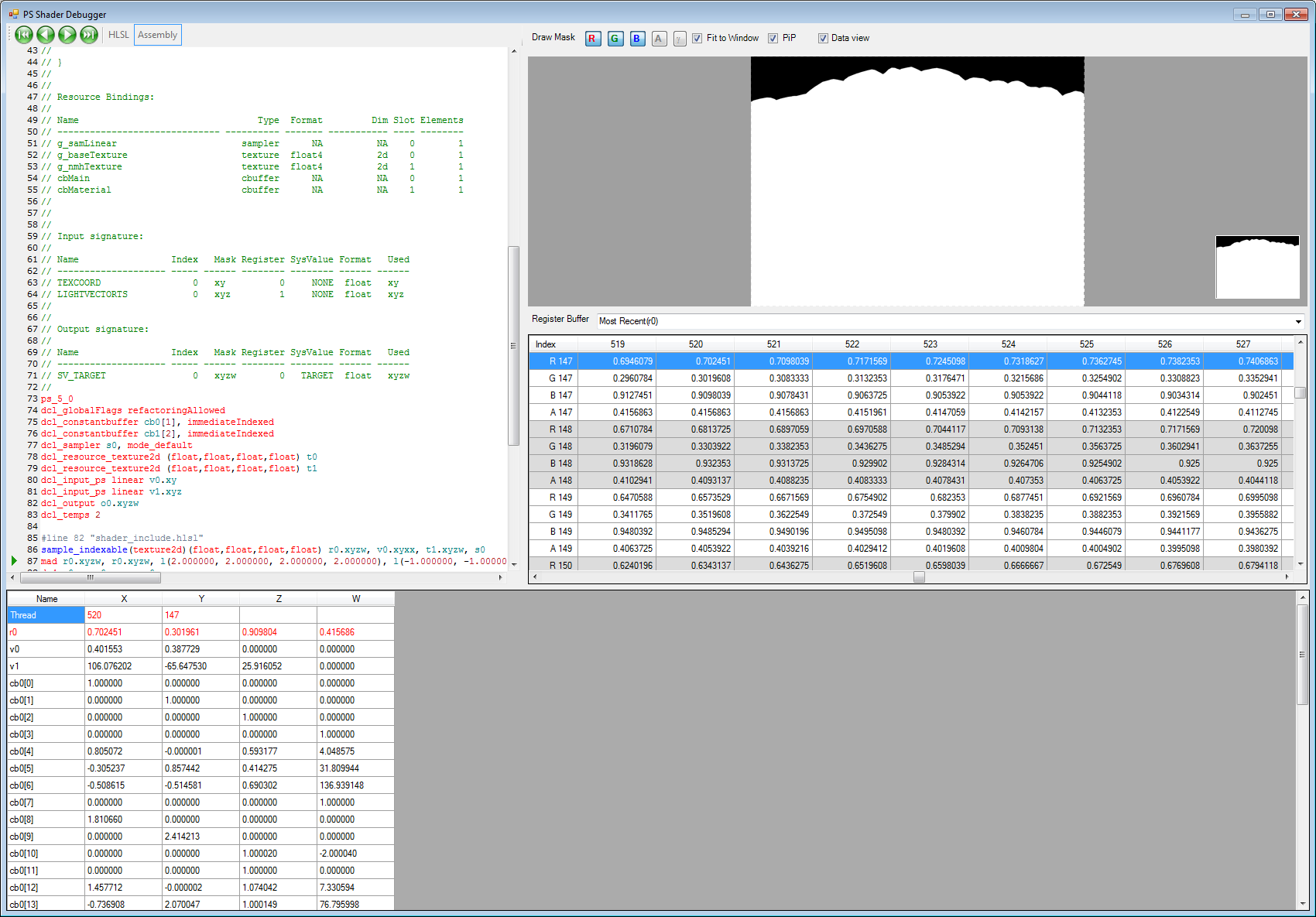 This screen shot shows a typical shader debug session. Stepping through the HLSL or Assembly code updates the draw masks on the right hand side, and updates the variables table at the bottom.