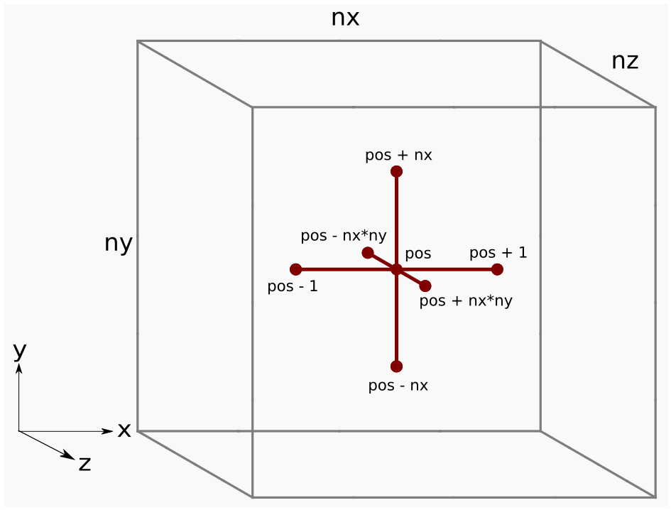 ∂x2∂2u≈hx2u(x−hx,y,z)−2u(x,y,z)+u(x+hx,y,z)where hx is the grid spacing in the x-direction (the distance between adjacent grid points in the x-direction). Extending this to three dimensions involves applying this stencil in all spatial directions: