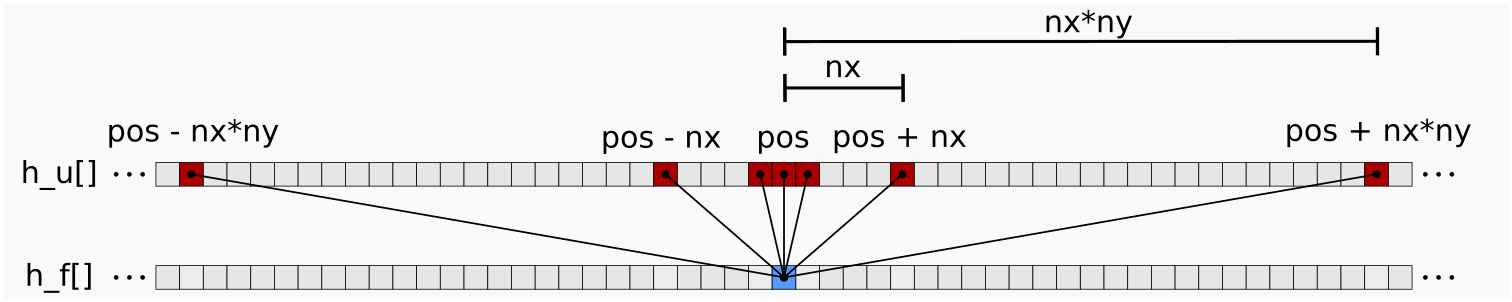 Figure 2: Strided memory space for the central difference stencil. Here we see which entries in the h_u[]