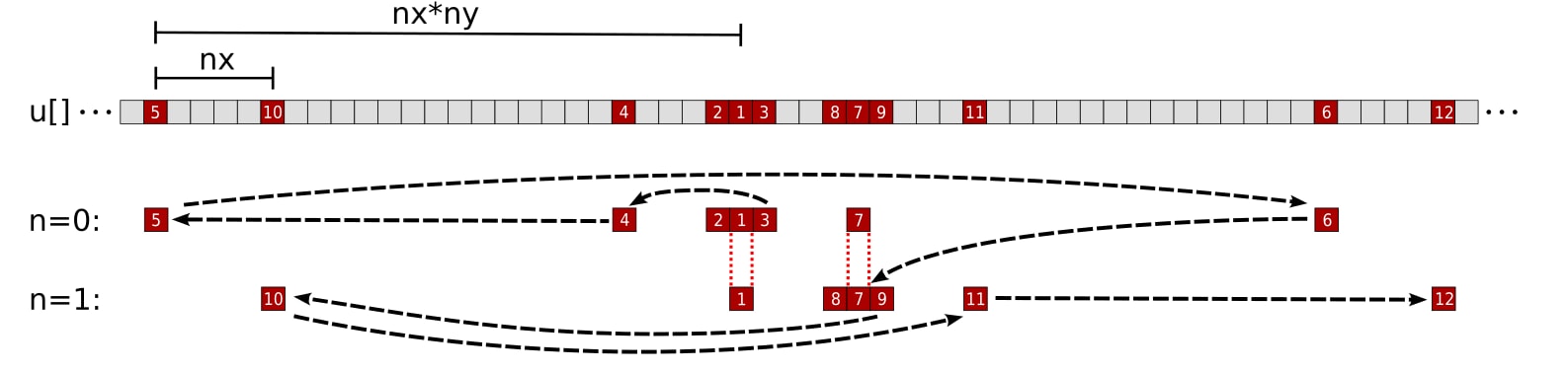 // z + 1, loop tiling for (int n = 0; n < m; n++) Lu[n] += u[pos + slice + n*nx] * invhz2;Another conditional operator is used so that it computes the y + 1 stencil of the n = m - 1 grid point so long as it does not lie on the y boundary.