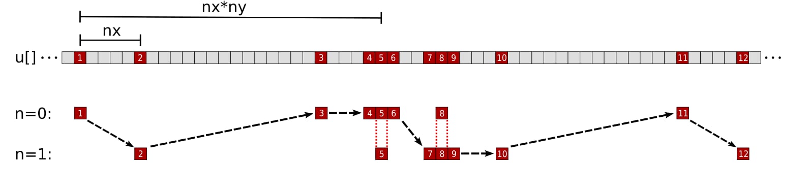 Before we dive into the optimized Laplacian kernel, let us first consider a small example to further explain the concept and benefit of loop tiling: Suppose we want to perform the strided computation f[pos] = u[pos - 1] + u[pos] + u[pos + 1]. Without tiling, each thread would need to perform three loads and one store instruction. It would be ideal if we could have each thread only load one u element and reuse the other two u elements already loaded and stored in registers. In other words, we should try to minimize the number of loads per store instruction per thread. If we tile by some factor, let’s pick two, then each thread would perform two stores, but consider the number of loads:
