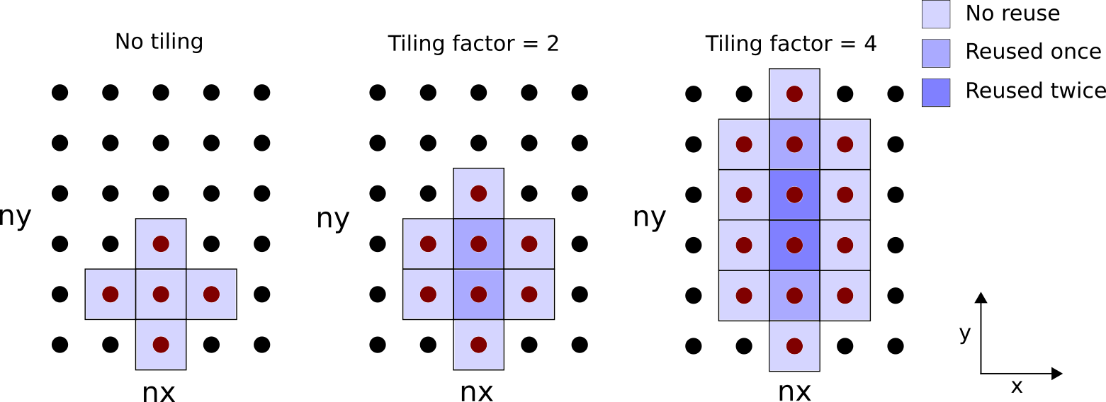 Figure 1: Illustration of loop tiling for each thread on an xy plane. The number of grid points loaded and reused depends on the tile width.