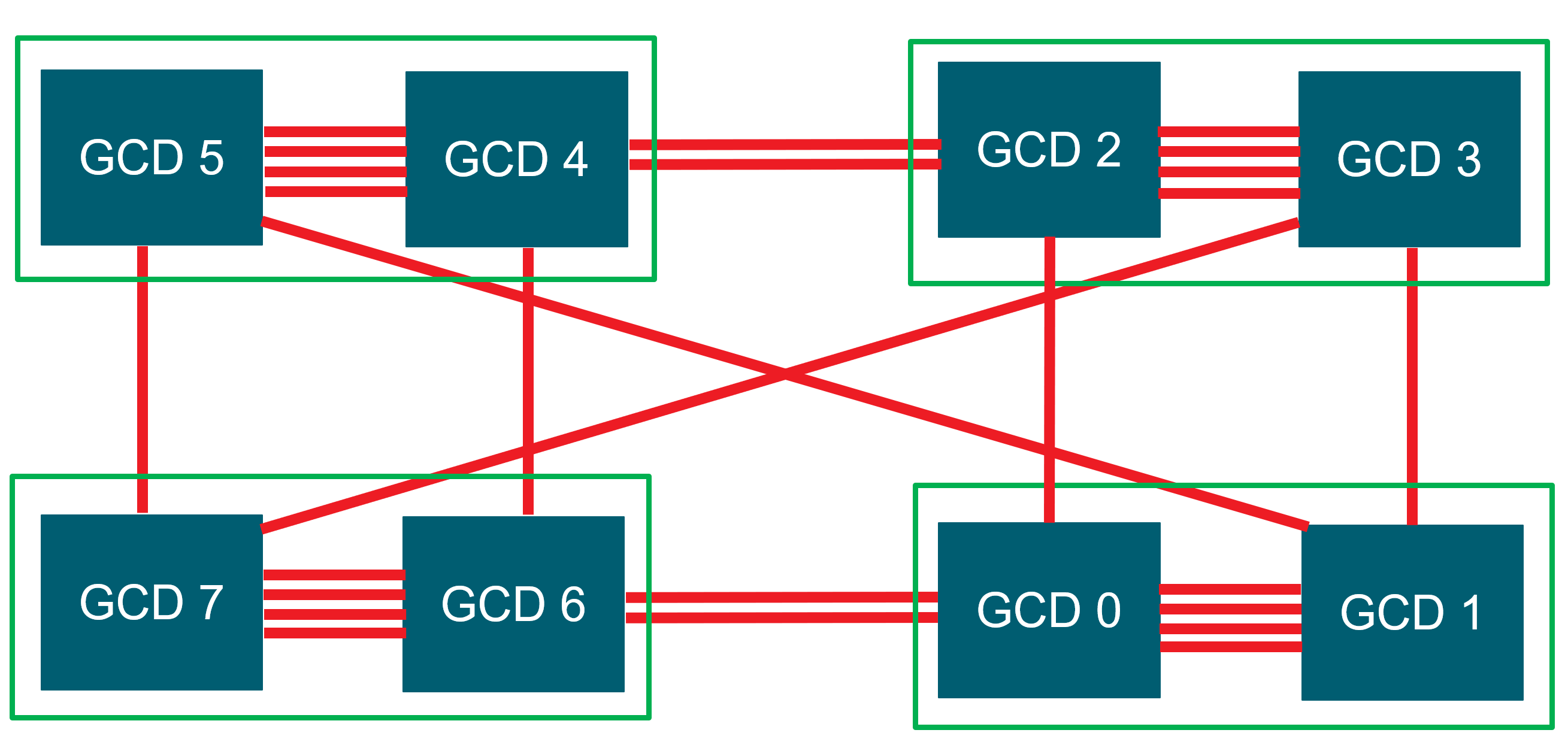 Figure 1. Diagram of a node with 4 MI250 GPUs (8 GCDs). Each green box is one MI250 GPU with two GCDs. The GCDs are connected through infinity fabric links.