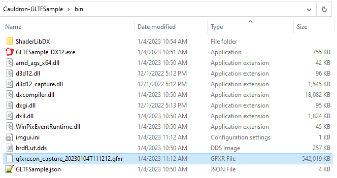 Third, we observe the creation of our GFXReconstruct .gfxr capture file, which will be ready for consumption once the application is closed. By default, the capture file will be created in the application’s working directory, highlighted below: