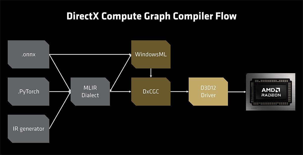 Microsoft and AMD have collaborated on the design of DirectX CGC, a new DirectX ML API that enables native GPU acceleration for full model execution. Complex ML models are brought into the DirectX pipeline and processed through MLIR Dialect, allowing DirectX and our AMD driver to optimize kernels, scheduling, and memory utilization for the underlying AMD GPU. On AMD, the runtimes transform these models for the targeted hardware and leverage the latest AMD kernel libraries to take full advantage of advanced AMD ML compute blocks.