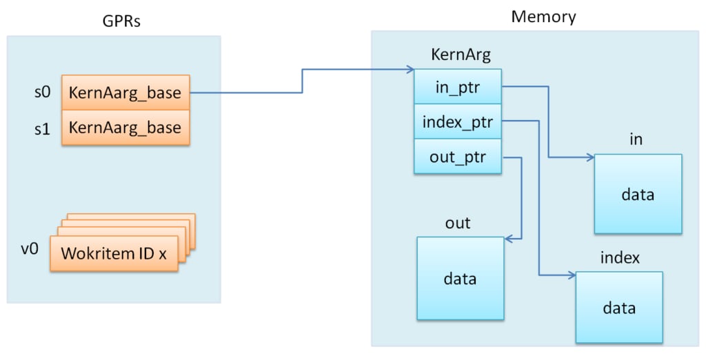 // Fill Kernarg memoryKernarg(in); // Add base pointer to “in” bufferKernarg(index); // Append base pointer to “index” bufferKernarg(out); // Append base pointer to “out” buffer