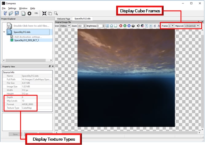 data types is provided, and additional format support will be available with the next release. MipLevel cube maps are supported, and users can view compressed cube-mapped files in DDS or KTX file formats.