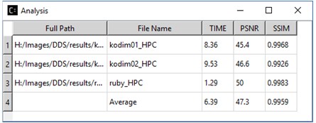 A new table view is now provided for users to view test analysis results for performance, PSNR, and SSIM analysis. This view can be used both during and after the processing of image textures. Previously in v3.1, users would have to run Image Difference Views on each processed texture to view PSNR and SSIM results, which ends up being very time consuming for a large number of images. An amalgamated results view is now available for users to collect and review results for processed images.