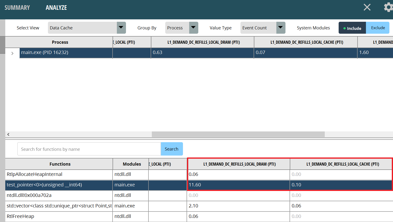 function. It is obvious that there are 11.60 memory reads caused by L1 cache misses and 0.1 lower-level cache reads caused by L1 cache misses and 0.1 L3 cache reads caused by L1 cache misses per 1,000 instructions. The number of memory reads should be as low as possible.