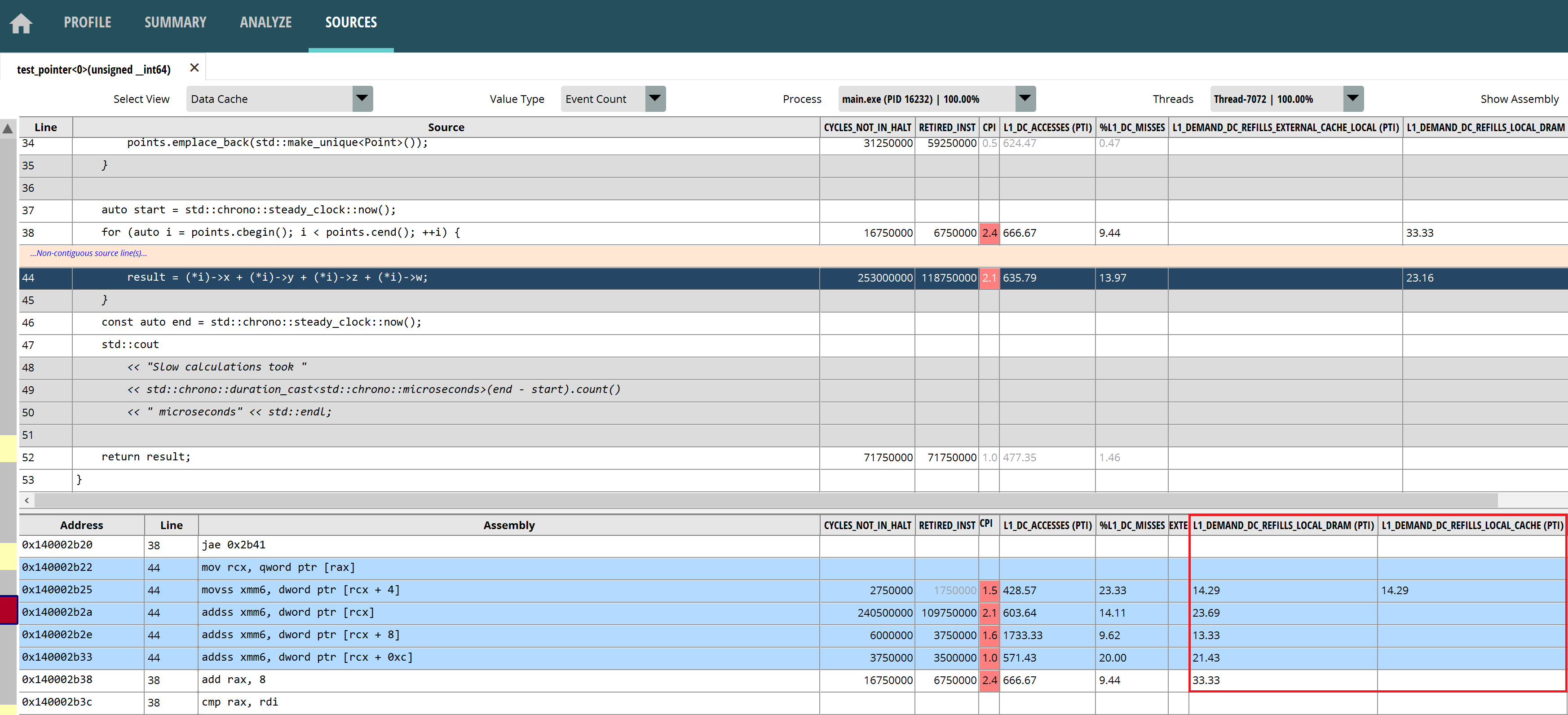 function to open the “SOURCES” page. You can see that cache prefetch failures do occur mostly near the pointer operations.