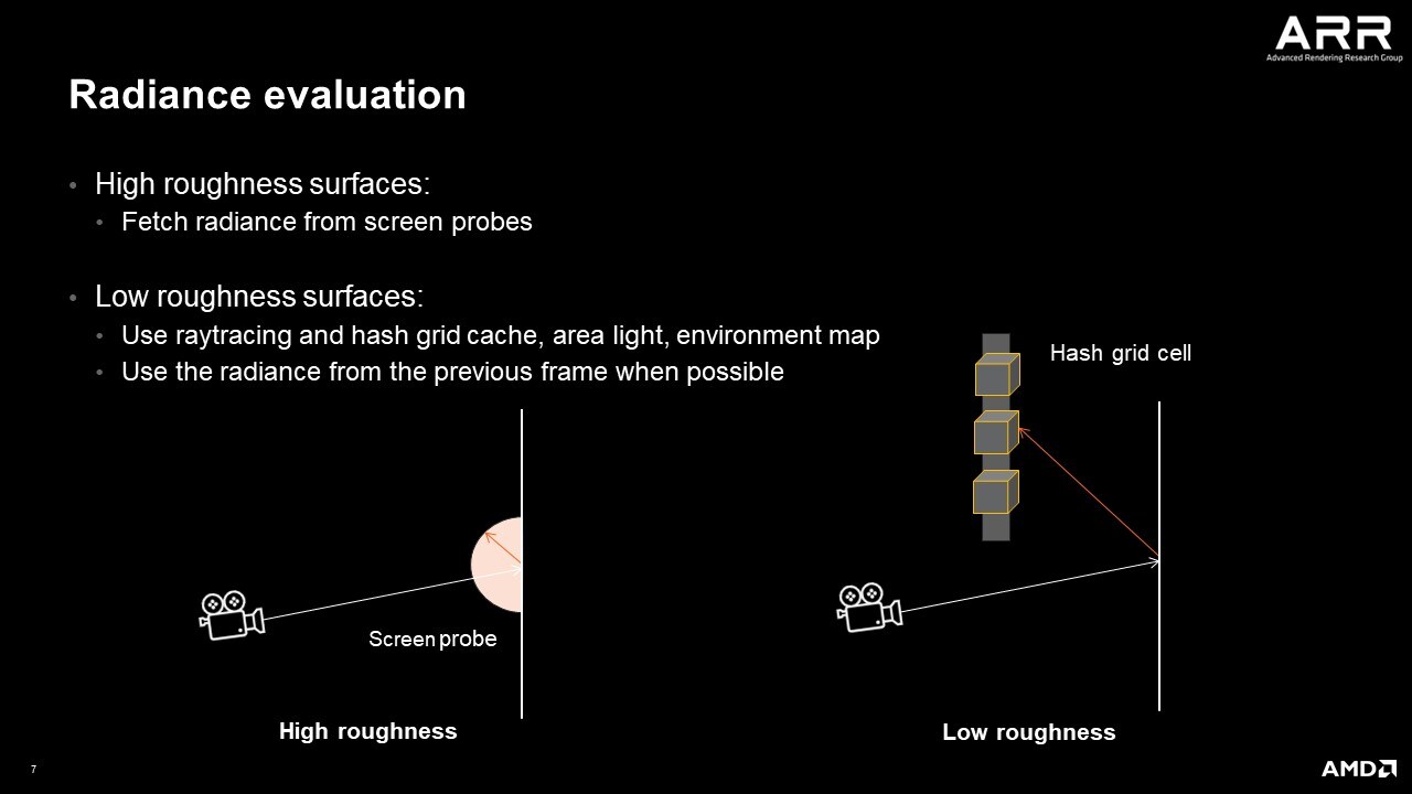 Specular interpolation uses the 1st-level radiance cache: Screen probes. Ray-traced reflection uses raytracing and 2nd-level radiance cache: Hash grid cache. We dynamically change these two radiance evaluation strategies based on the roughness parameter at the shading point. It helps to render glossy reflections accurately and efficiently.