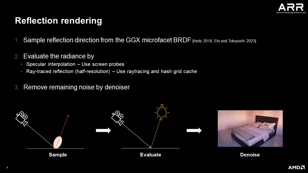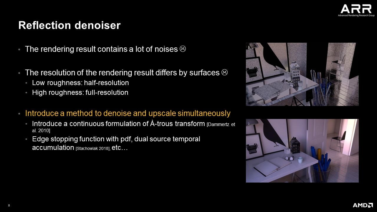 And finally, our reflection denoiser removes noises from the rendered image. Our denoiser can denoise and upscale simultaneously and enables the creation of a simple post-process pipeline for glossy reflections.