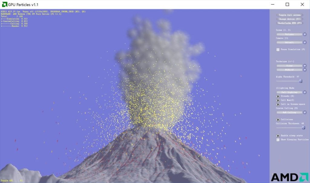 This sample demonstrates how to implement a simple GPU-based particle system. It also shows how to perform depth buffer collisions as well as sorting the particles on the GPU for correct blending of rasterized billboards.