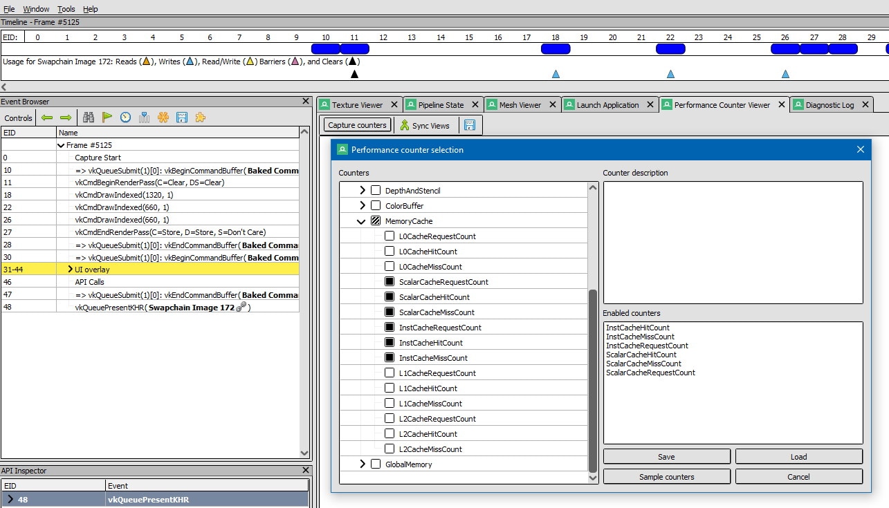 We have also included new memory cache counters for analyzing scalar and instruction cache activity of measured workloads in this release. We are planning to add these counters in a future RenderDoc1 release as well.