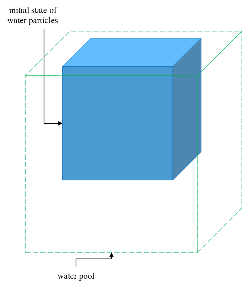 In a cubic water pool of , water particles fall from the pool ceil. The initial shape of the water volume is a cube of . Water particles are uniformly distributed in the water volume, and the number of particles is specified as . For other parameters, please refer to the property of water, such as the rest density and particle mass derived from the aforementioned conditions. The viscosity value is . The stiffness value of all pool walls is . The particle search radius is specified as , i.e., SPH smoothing radius .
