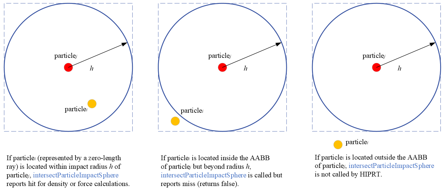 hiprtAABBListPrimitive list;list.aabbCount = sim.m_particleCount;list.aabbStride = sizeof( Aabb );std::vector<Aabb> aabbs( sim.m_particleCount );for ( u32 i = 0; i < sim.m_particleCount; ++i ){ const hiprtFloat3& c = particles[i].Pos; aabbs[i].m_min.x = c.x - smoothRadius; aabbs[i].m_max.x = c.x + smoothRadius; aabbs[i].m_min.y = c.y - smoothRadius; aabbs[i].m_max.y = c.y + smoothRadius; aabbs[i].m_min.z = c.z - smoothRadius; aabbs[i].m_max.z = c.z + smoothRadius;}Since the particle AABBs can be updated per frame, we choose hiprtBuildFlagBitPreferFastBuild mode to build the acceleration structure and will rebuild the entire hiprtGeometry each frame.