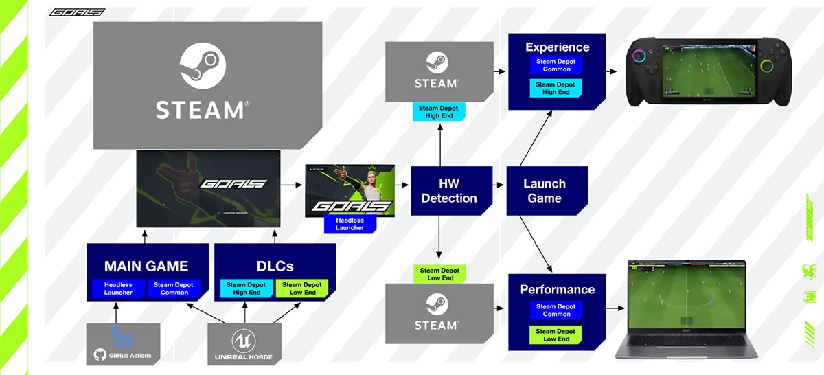 GOALS is a free-to-play competitive football game, using our custom-built, patent-pending SENTEC simulation engine with Unreal® Engine for the presentation layer, designed for crossplay across PC, console, mobile, and handheld. During our playtests in alpha, hardware telemetry revealed something instructive: a meaningful share of our players were on hardware that many would consider obsolete, graphics cards dating back to 2013, and up to 9% of the player population on devices that fell into this category. Experience from other free-to-play titles suggests that number could climb toward 30% post-launch.
