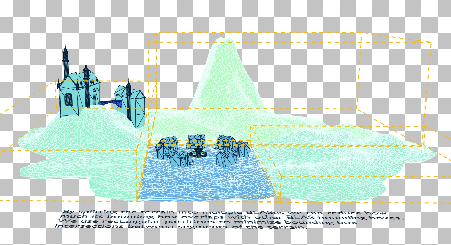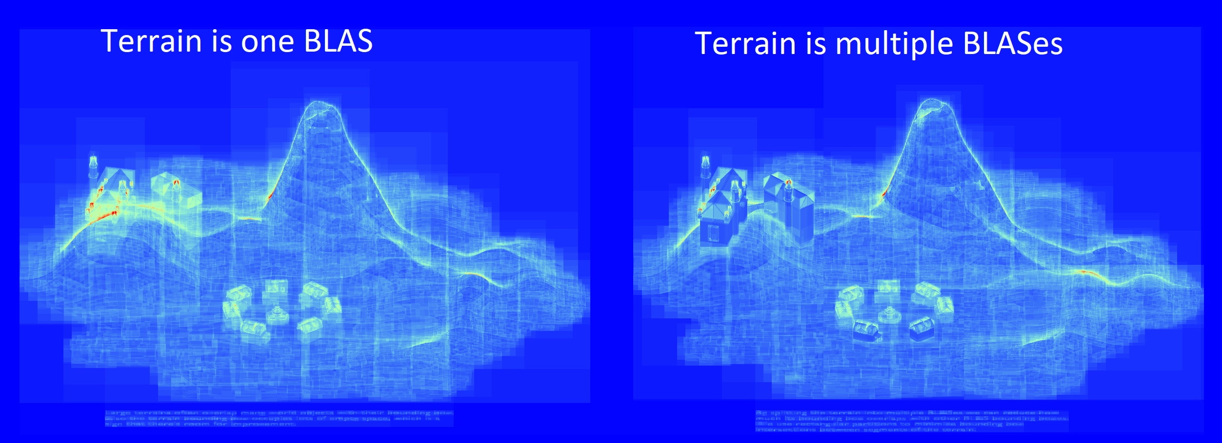 The developer, however, is responsible for grouping their application’s mesh data into geometries contained within bottom-level acceleration structures (BLASes) and placing instances of them into a top-level acceleration structure (TLAS). Instances whose bounding boxes occupy lots of empty space, or have significant overlap with other instances’ bounding boxes can hurt traversal performance. A common example of that issue is to make a game’s terrain one big BLAS, with a bounding box overlapping everything in the scene.