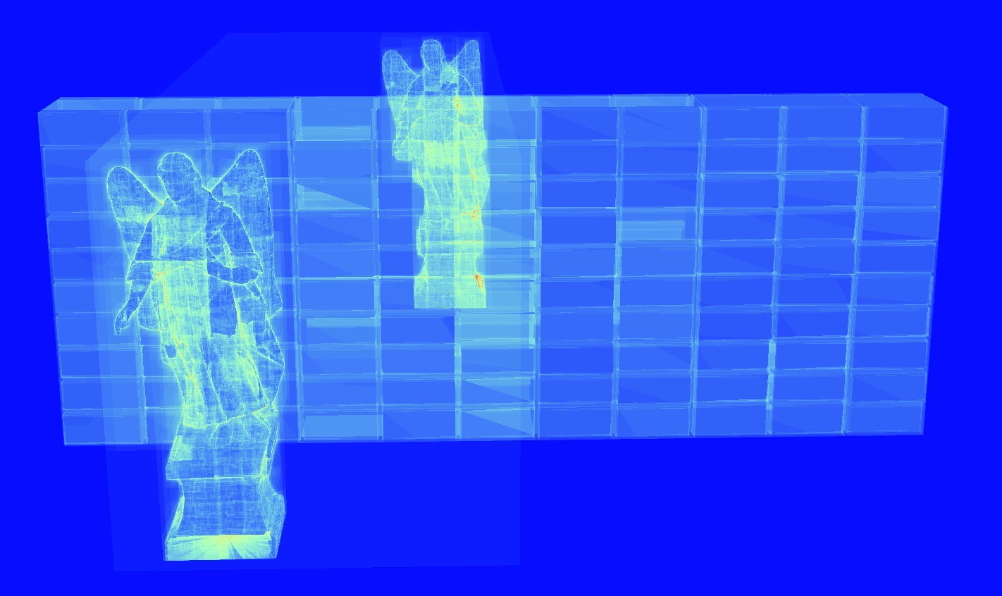 In this example, both angel statues are in the same BLAS, so the blue bounding volumes of the angels and wall are intersecting, resulting in the ray first traversing the angel’s BLAS before traversing and being terminated by the wall’s BLAS.