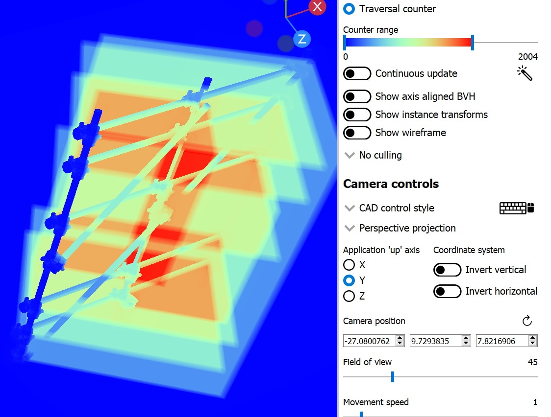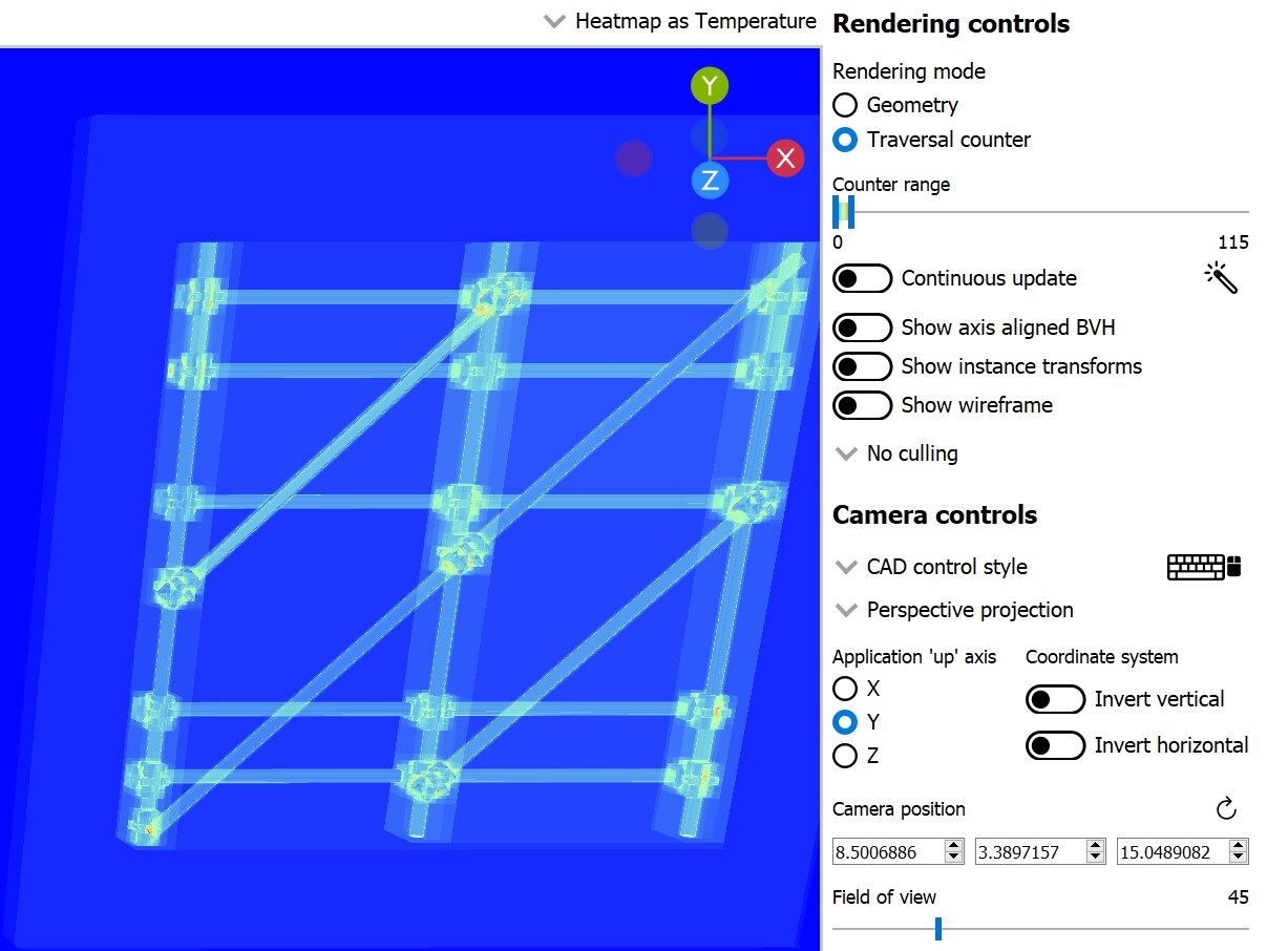 Switching to traversal counter mode, the scaffolding is producing traversal counts greater than 2000, and will likely cause a noticeable drop in the framerate when it’s on screen in your application.