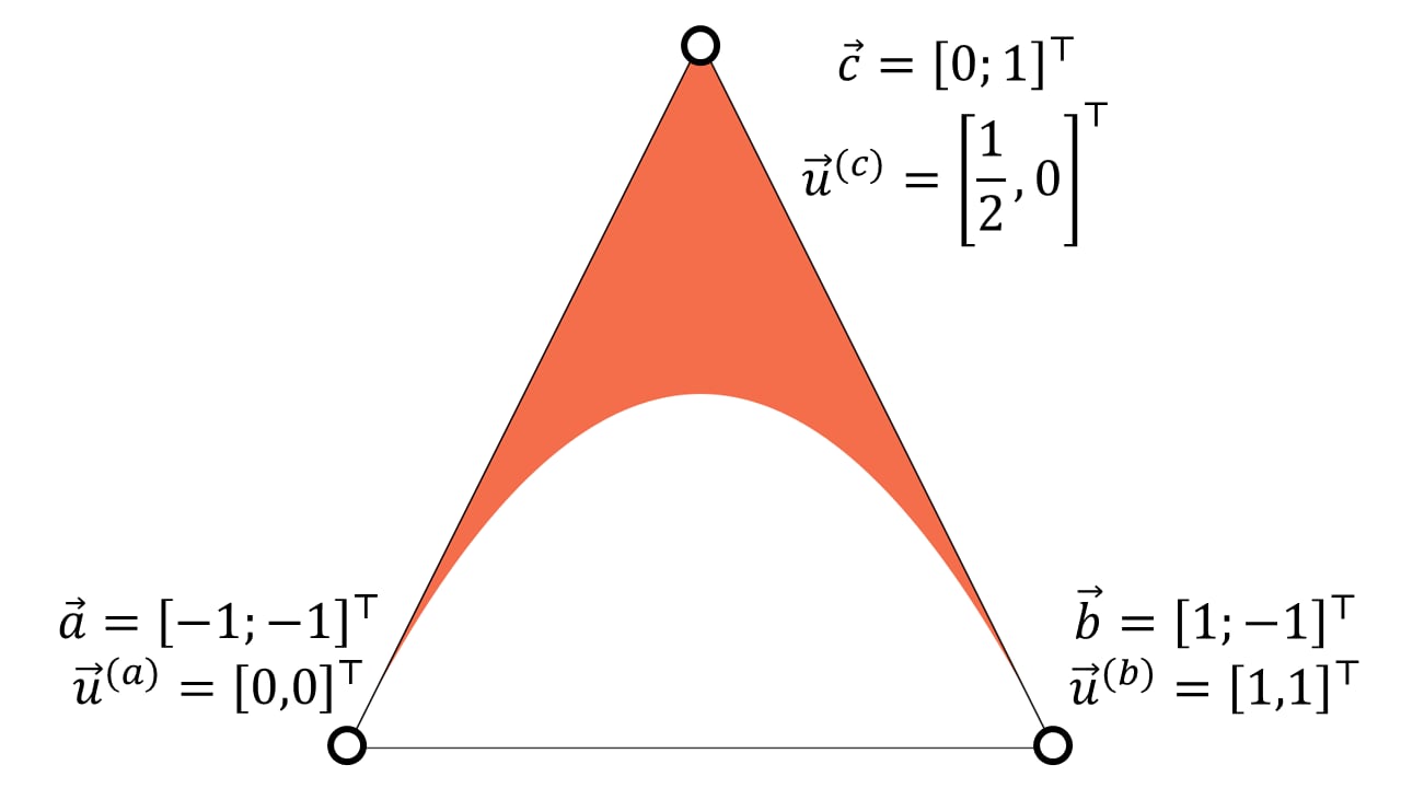 As a solution, we propose not to store the control points of the canonical quadratic Bézier curve, thus the values for [u;v]⊤, at all. Instead, we compute the interpolated [u;v]⊤ in the pixel shader from barycentric coordinates: