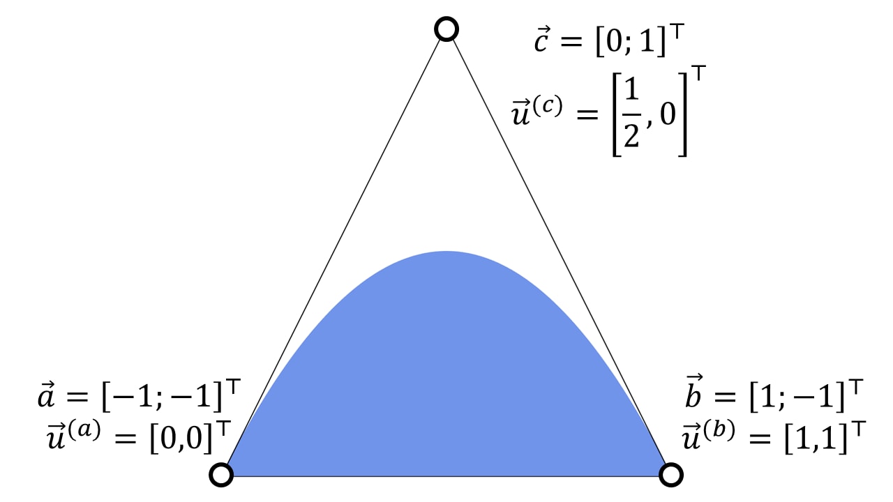 Loop’s and Blinn’s observation is that the rasterization stage interpolates [u;v]⊤. This carries out an affine transformation from the positions of the quadratic Bézier curve with the control points a, c, and b in to the coordinate space of canonical Bézier curve with the control points [0;0]⊤, [21;0]⊤, and [1;1]⊤. Since Bézier curves are invariant under affine transformations, the simple predicate works for all a‘s, c‘s, and b‘s.