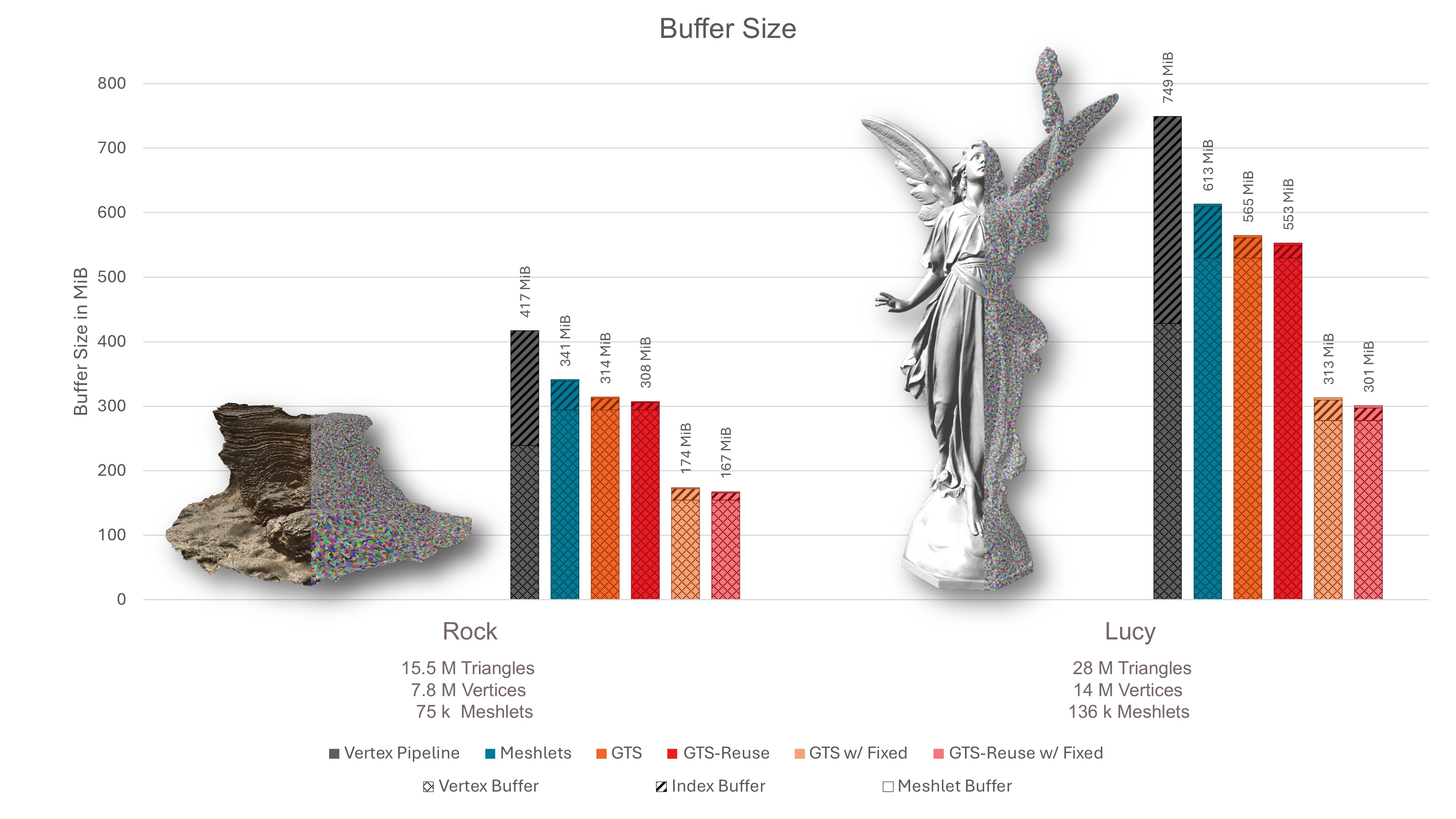 As can be seen, using the baseline mesh shader already achieves a compression compared to the vertex pipeline, because the reduction from 32 to 8 bit indices outweighs the required duplication of attributes. By further packing the triangles in a Generalized Triangle Strip, the indices are compressed with a ratio of ∼4:1 compared to the meshlet baseline, or ∼16:1 compared to the vertex pipeline. Thus, after compression, the index buffer becomes a negligible quantity compared to the size of the quantized vertex buffer. Note that we used a very conservative quantization of vertex attributes. Much higher vertex attribute compression ratios can still appear without loss iin visual quality.
