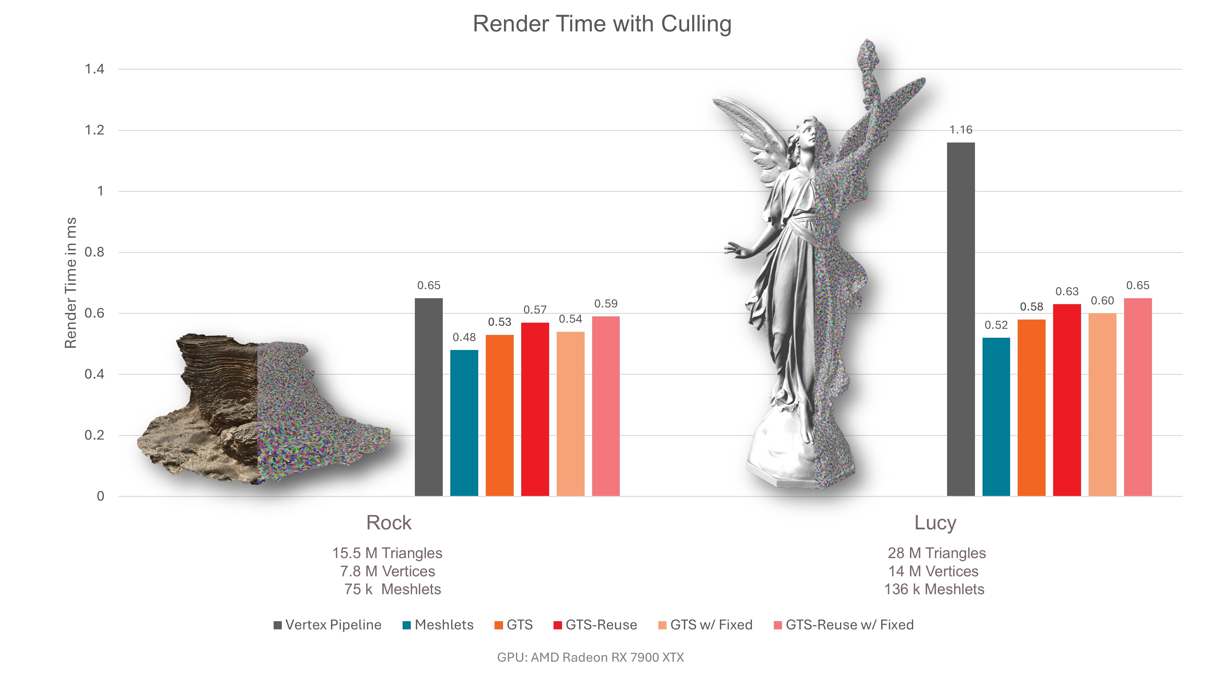 The next figure is the same measurement, but with cone culling enabled. As, on average, every second meshlet faces away from the camera, the performance can improve by up to a factor of two. However, this does not work for our rock mesh, as almost all meshlets face towards the camera.