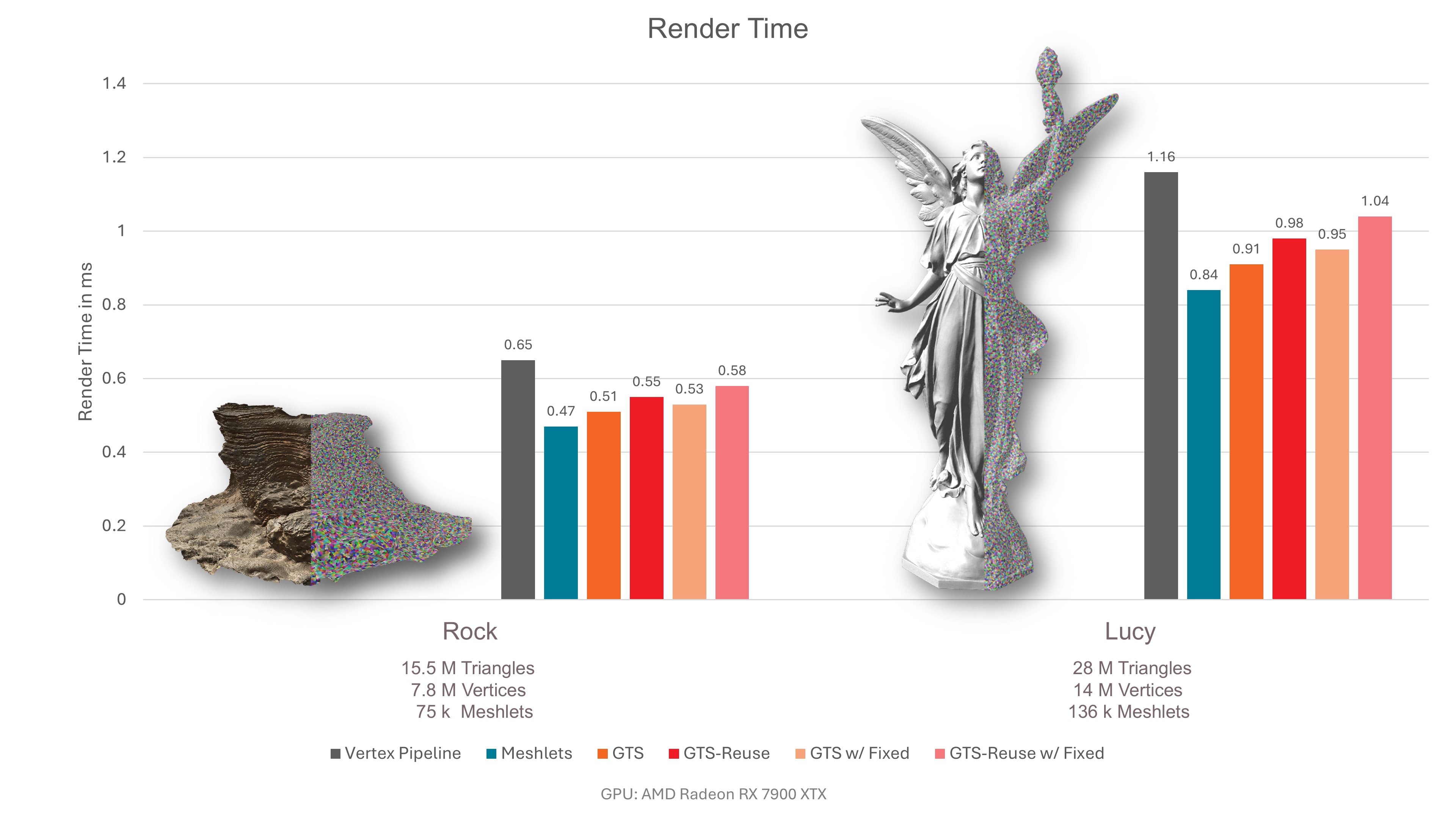 This project dates back to 2010, the time Quirin, one of this post’s authors, decompressed generalized triangle strips (GTS) in parallel on the GPU for his PhD thesis (see also a paper and a talk on that matter). The algorithm shares similarities with Epic Games’ GTS decompression introduced with Nanite in 2021. In 2010, however, compute shaders, as we know them today, did not exist, yet. Compute pipelines were separate APIs and thus a switch between graphics and compute was very expensive and slowed the overall rendering-time.