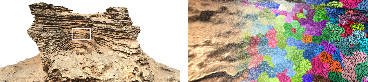Depending on the ratio between the bounding box of the mesh and the bounding box of the largest meshlet, the effective precision of the mesh-global quantization grid can be greater than the initial target of 16 bits. For example, the x-axis of the Rock mesh in the teaser image has an effective precision of 17.6 bits.