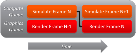 - The CPU side threading has been removed. The sample now leverages async compute as follows: