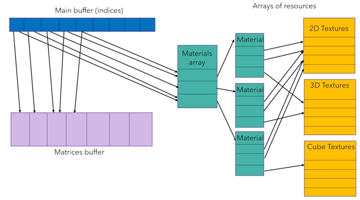 To optimize the speed of draw calls on PC, we use descriptor indexing with the extension VK_EXT_descriptor_indexing . The principle is simple: we can create a descriptor set containing all the buffers and textures used in the frame. Then we can access the buffers and textures with indices. The main advantage is that all resources are bound only once per frame even if they are used by many draw calls. This is very similar to bindless resources in OpenGL®.