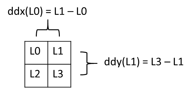 In fragment shaders, texture access that needs to determine the correct Level of Detail, or uses anisotropic filtering, relies on the calculation of implicit derivatives. The derivatives are computed based on the values across a 2×2 group of fragment shaders (a quad) for the current primitive.