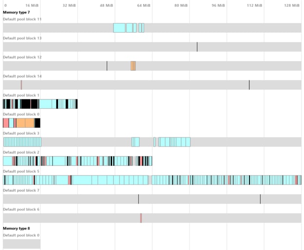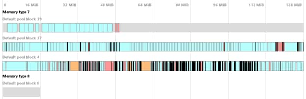 The implementation of defragmentation also pushed us to closely analyze GPU memory usage. VMA can dump all the allocations of a VmaAllocator in a file. The dump results can then be summed up in an image thanks to VmaDumpVis , allowing us to analyze the pools and dedicated allocations used by VMA. This dump was also useful for tracking memory leaks that were notably present when exiting a level in Detroit: Become Human and returning to the main menu, or when going to the next level (each allocation can be tagged with a name to be easily identifiable).