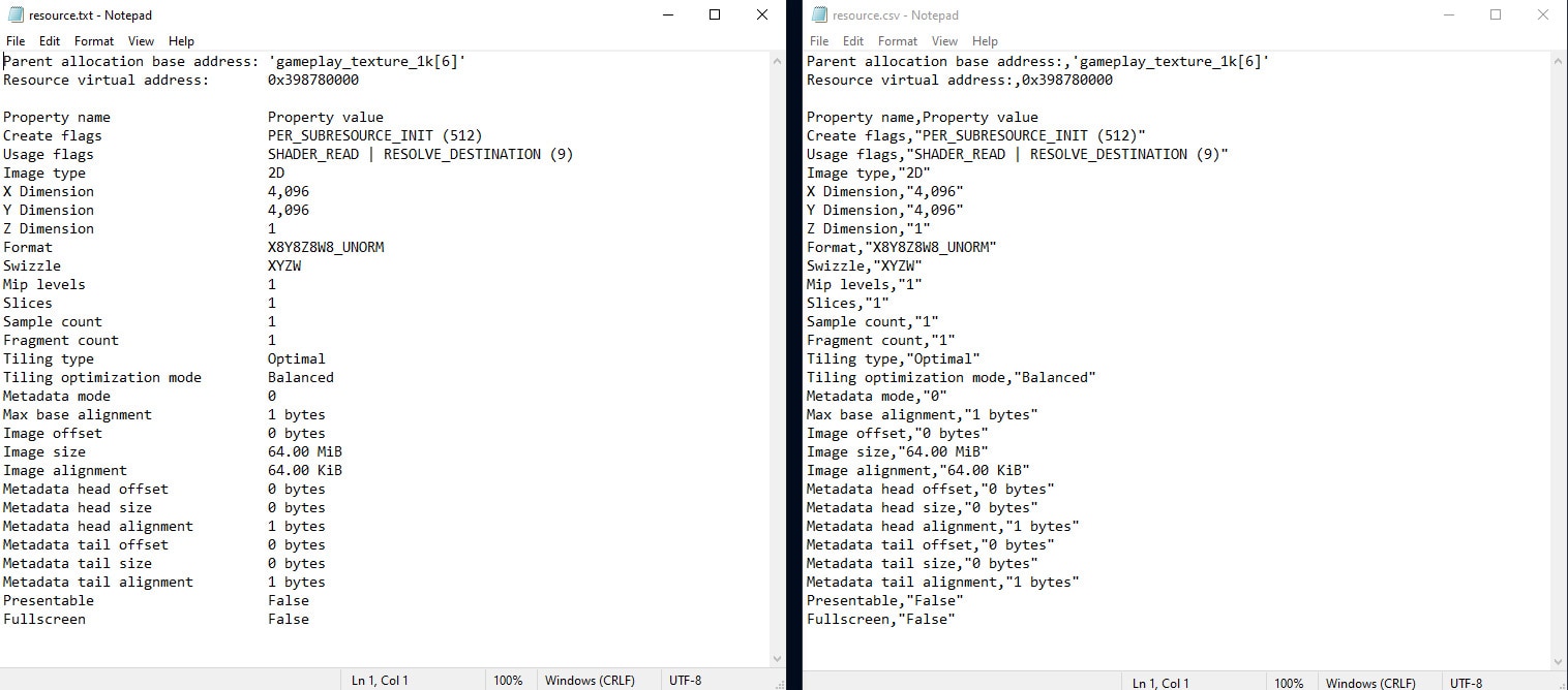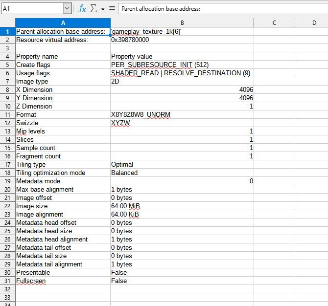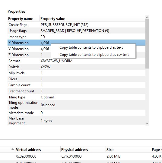 With the AMD Radeon™ Memory Visualizer v1.13, you can now copy the resource details to the clipboard, either as raw text or as comma-separated values so they can be pasted into a text file or spreadsheet, respectively. Simply choose the resource you are interested in and right-click the mouse on the ‘properties’ table. This will bring up a context menu as shown below: