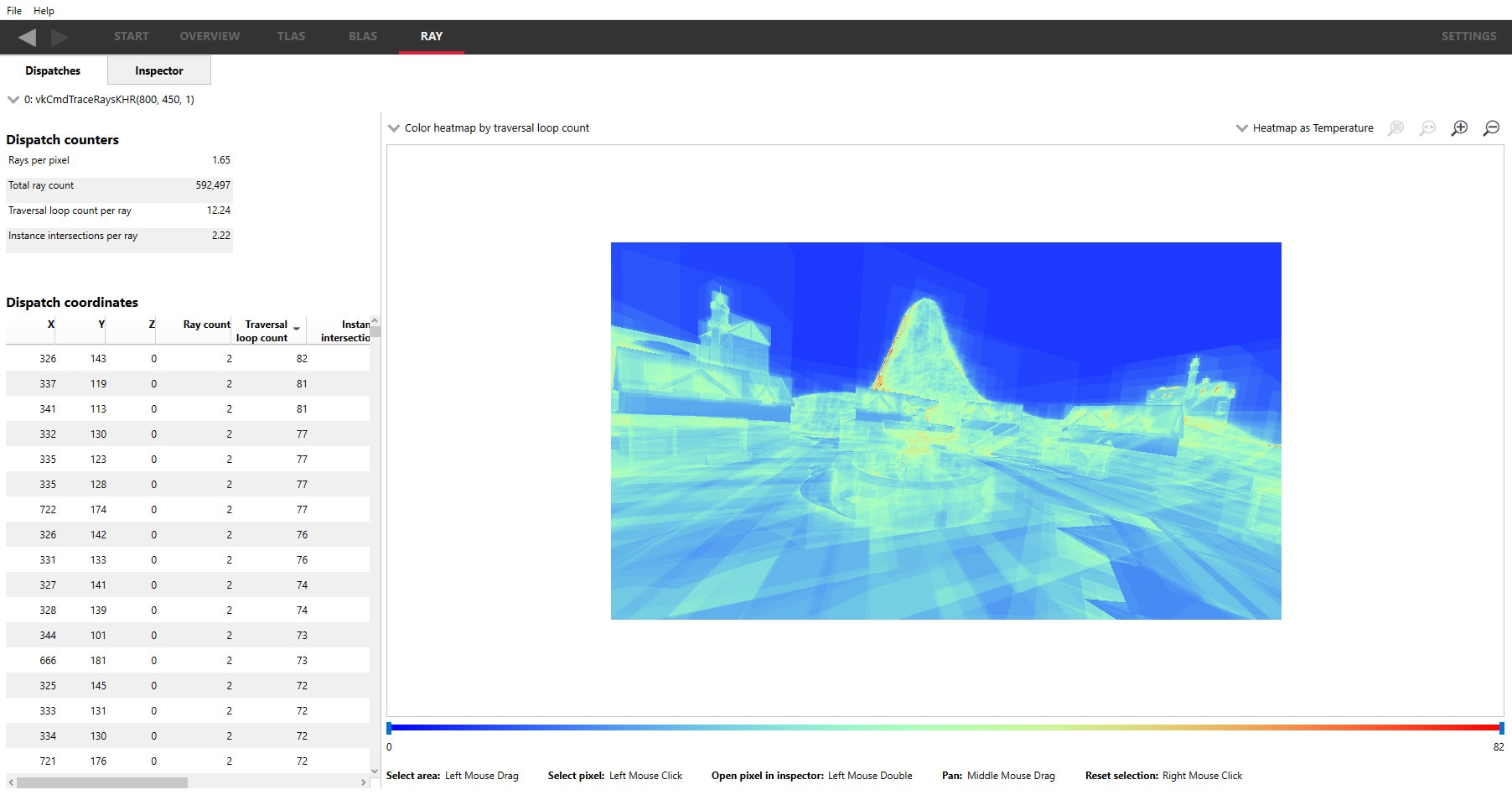 There is also the option to select the previous and next ray directly from the ray inspector pane, rather than jumping back to the Dispatches pane to sets things up. Start at the dispatches pane and sort the dispatch coordinates table as desired. A typical use case is to sort by traversal loop count, as seen here: