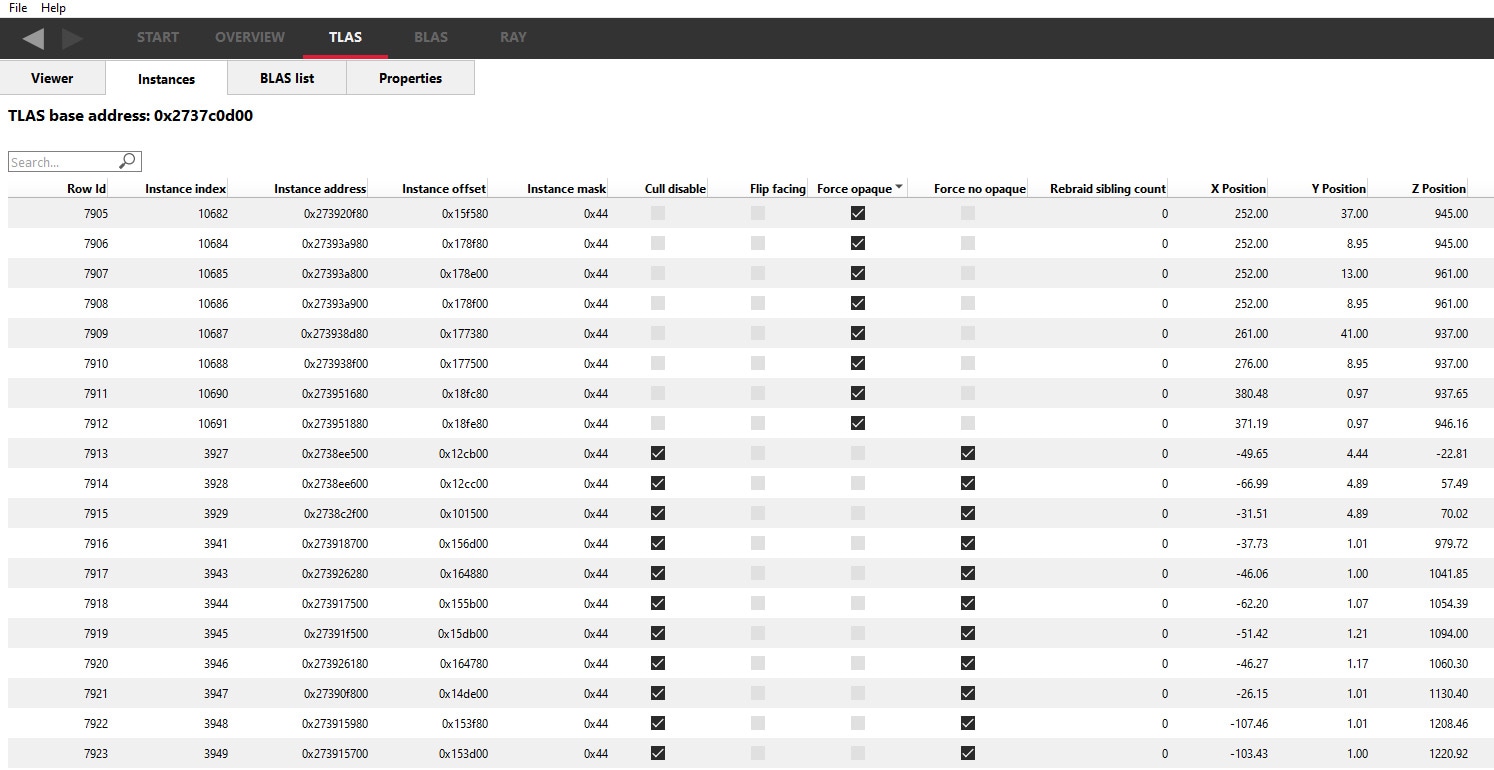 In the example below, the TLAS instances table is sorted by ‘Force opaque’. It can be clearly seen that there are 7913 instances that have this flag set (indices 0 .. 7912).