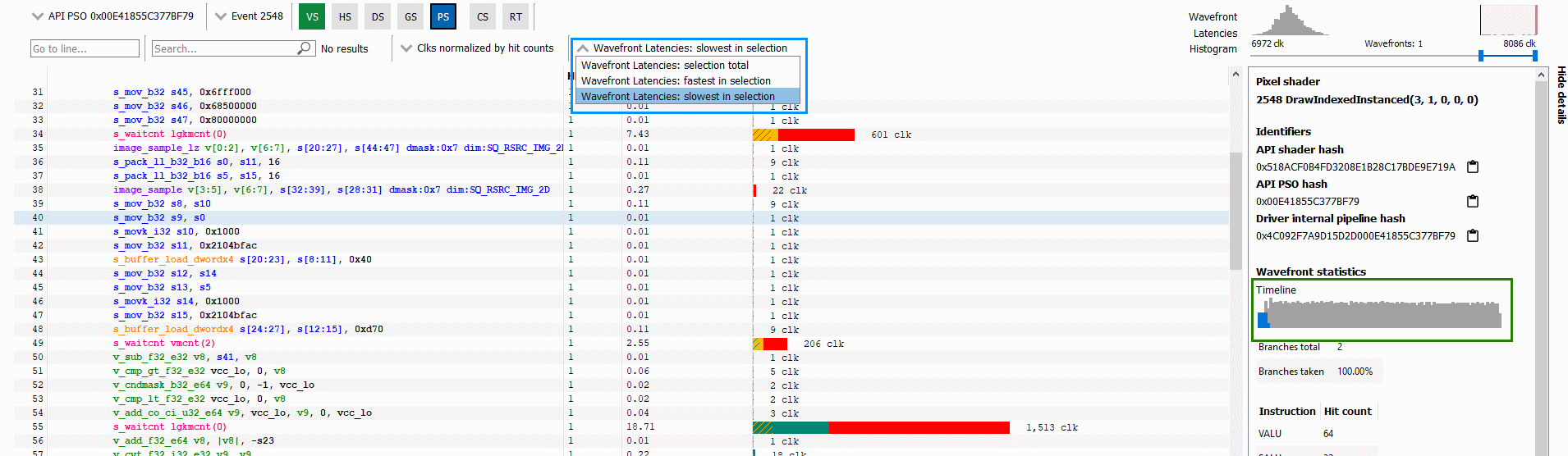 The latency bars shown for each instruction can now indicate where there is parallel VALU and SALU work being done on other waves slots, effectively showing you where latency may not be a problem because the GPU is able to perform other work. This can be seen in the screenshot below: