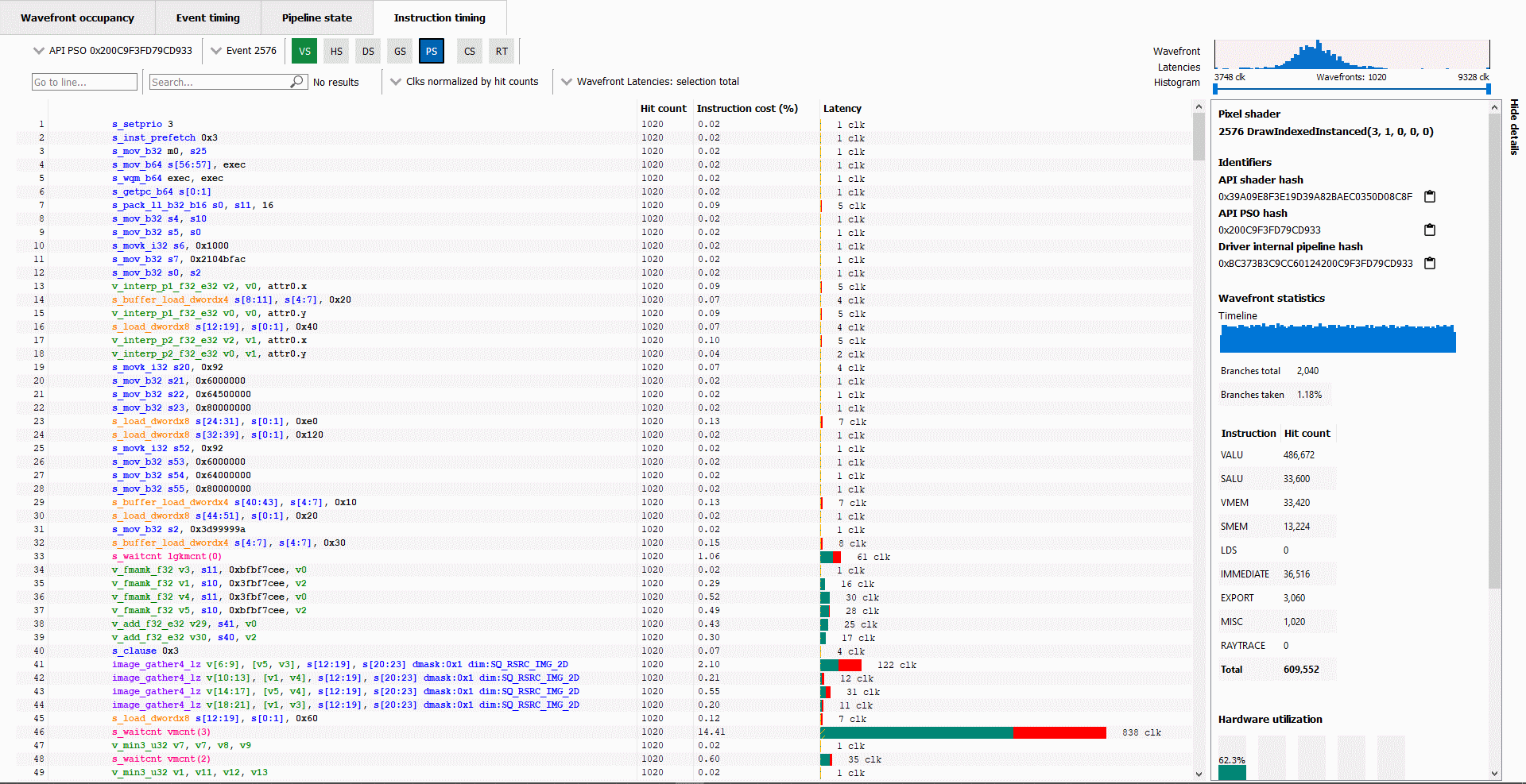 When you take a look at the Instruction timing pane in RGP, you will notice some new UI elements designed to provide additional insights into the performance characteristics of your shader.