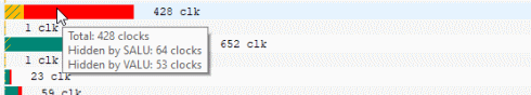 Contrast this with the image below, where an instruction is shown where more latency is hidden by SALU work. In this case, yellow is more prevalent than green.