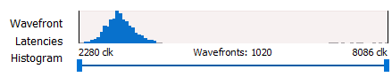 In the above screenshot, you can see that for the selected event, 1020 wavefronts were analyzed. Those wavefronts ranged in performance from 2280 clocks (the fastest) to 8086 clocks (the slowest). The histogram shows the distribution of wavefronts across that range of clock values, with most of the waves appearing at the low end of the distribution.