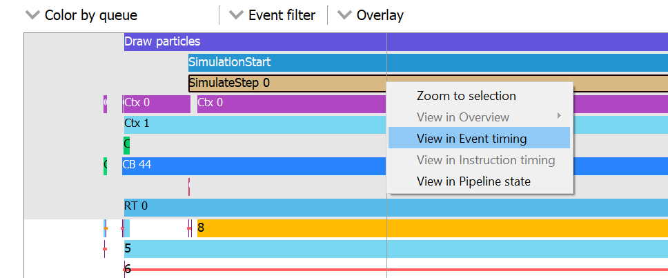 As seen below, all you need to do is right click on a User event, Hardware context, Command buffer, or Render/Depth target, and use the context menu to view the selected item in one of the other panes in RGP. In addition to navigation commands, the context menu also supports zooming the view to selected Overlay.