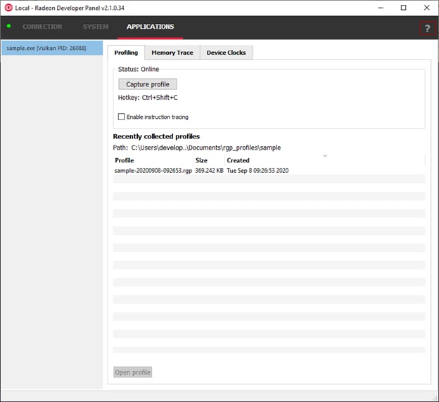 One of the major changes that veteran RGP users will notice right away is the presence of a completely redesigned Radeon™ Developer Panel. The new panel supports both Radeon™ GPU Profiler and Radeon™ Memory Visualizer.