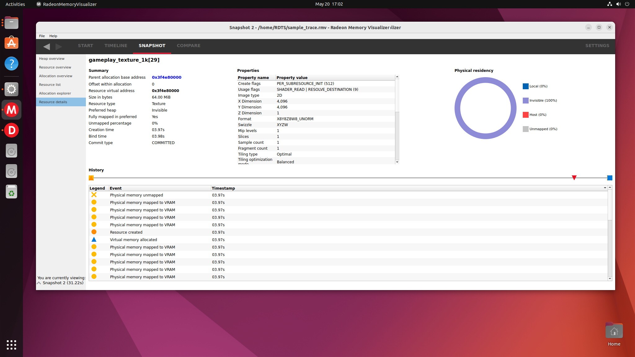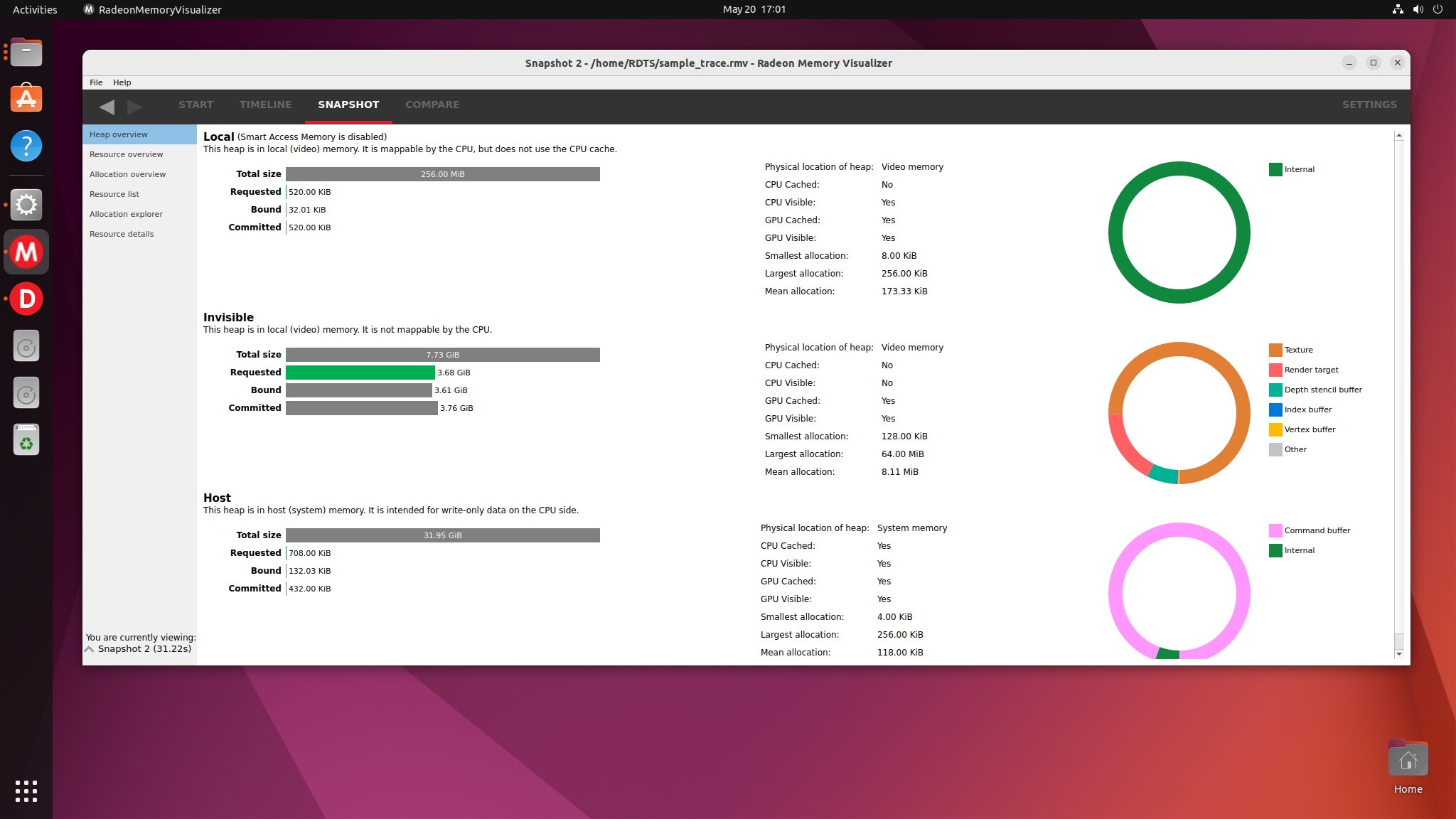 AMD Radeon™ Memory Visualizer (RMV) is a tool to allow you to gain a deep understanding of how your application uses memory for graphics resources.