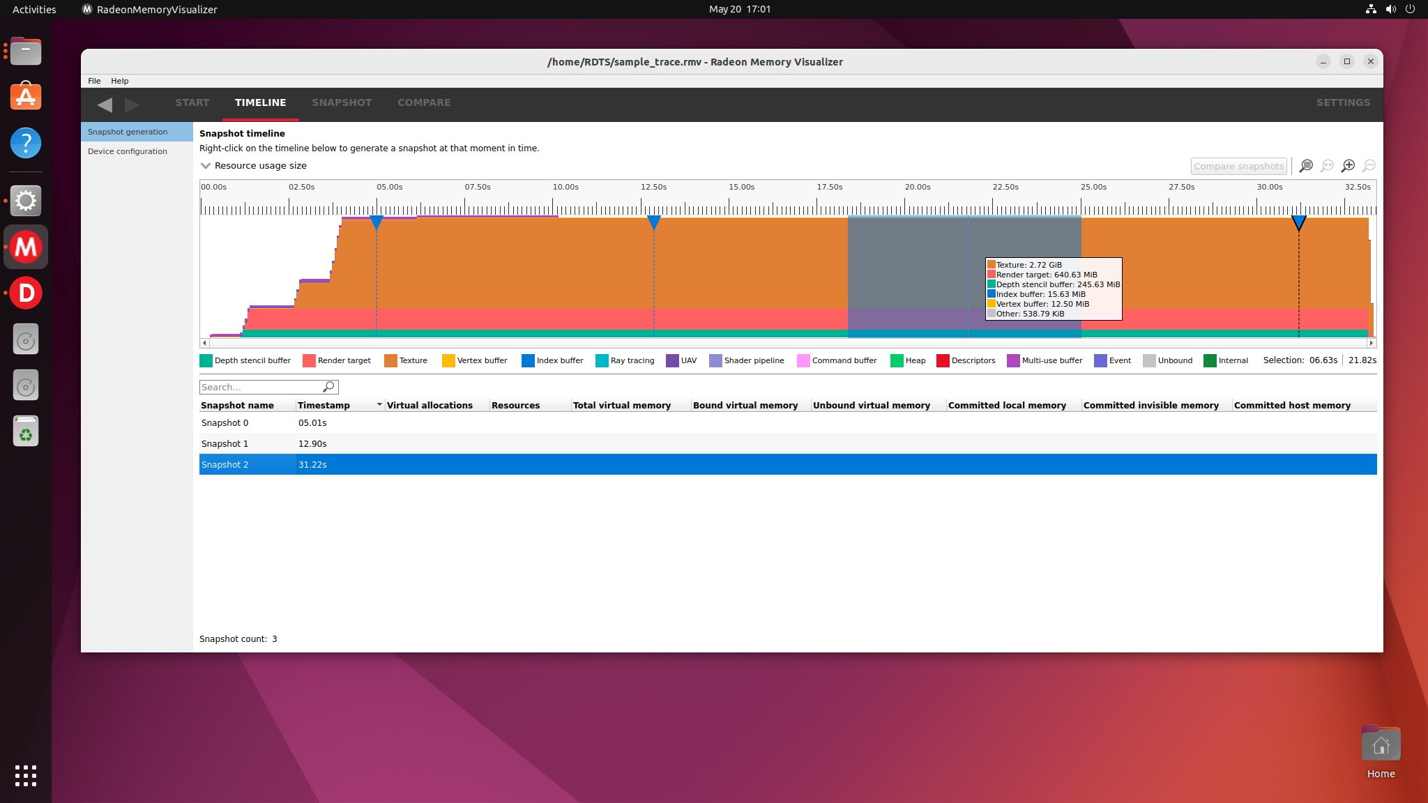 The user experience and workflow of RDP and RMV on Linux closely resembles that of the Microsoft Windows-based version. To capture a memory trace, simply start RDP, then start the Vulkan application to be tested, navigate to the Memory trace pane on the Panel and click the Dump trace button. This will dump the memory trace to a file. One difference to be aware of when running RDP on Linux is that a setup script must be run each time the PC is rebooted in order to enable Linux permissions. For more information, see the RDP documentation.