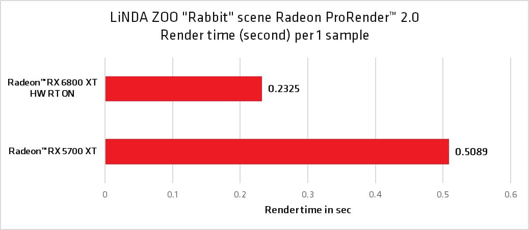 The hardware acceleration can not only accelerate ray-triangle intersection, but it can accelerate rendering a scene with curves. Here is a performance comparison of a test “rabbit” scene made with Radeon™ ProRender by LiNDA ZOO using the Ephere Ornatrix hair plug-in for Autodesk® Maya®. As you can see, we are getting an impressive performance improvement on an AMD Radeon™ RX 6800 XT GPU.