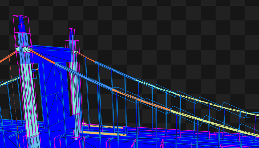 In RRA, OBBs can be viewed in the 3D view by ensuring the “Show bounding volumes” checkbox is enabled. In this image they appear as rotated boxes bounding the suspension bridge’s cables.