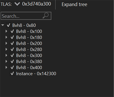 Nodes in the new format can have up to 8 children and are identified by the “Bvh8” in the scene tree.