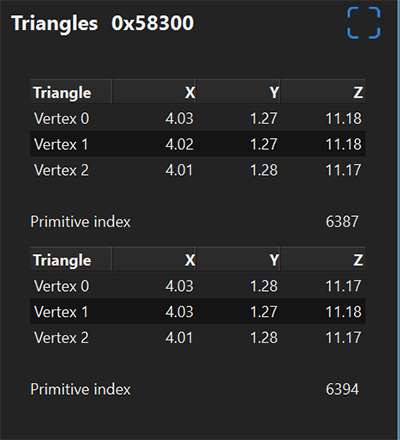 Switching to the BLAS pane, triangle nodes can now contain up to 8 triangles as well. Each triangle will be listed in the left pane with its own vertex table and primitive index.